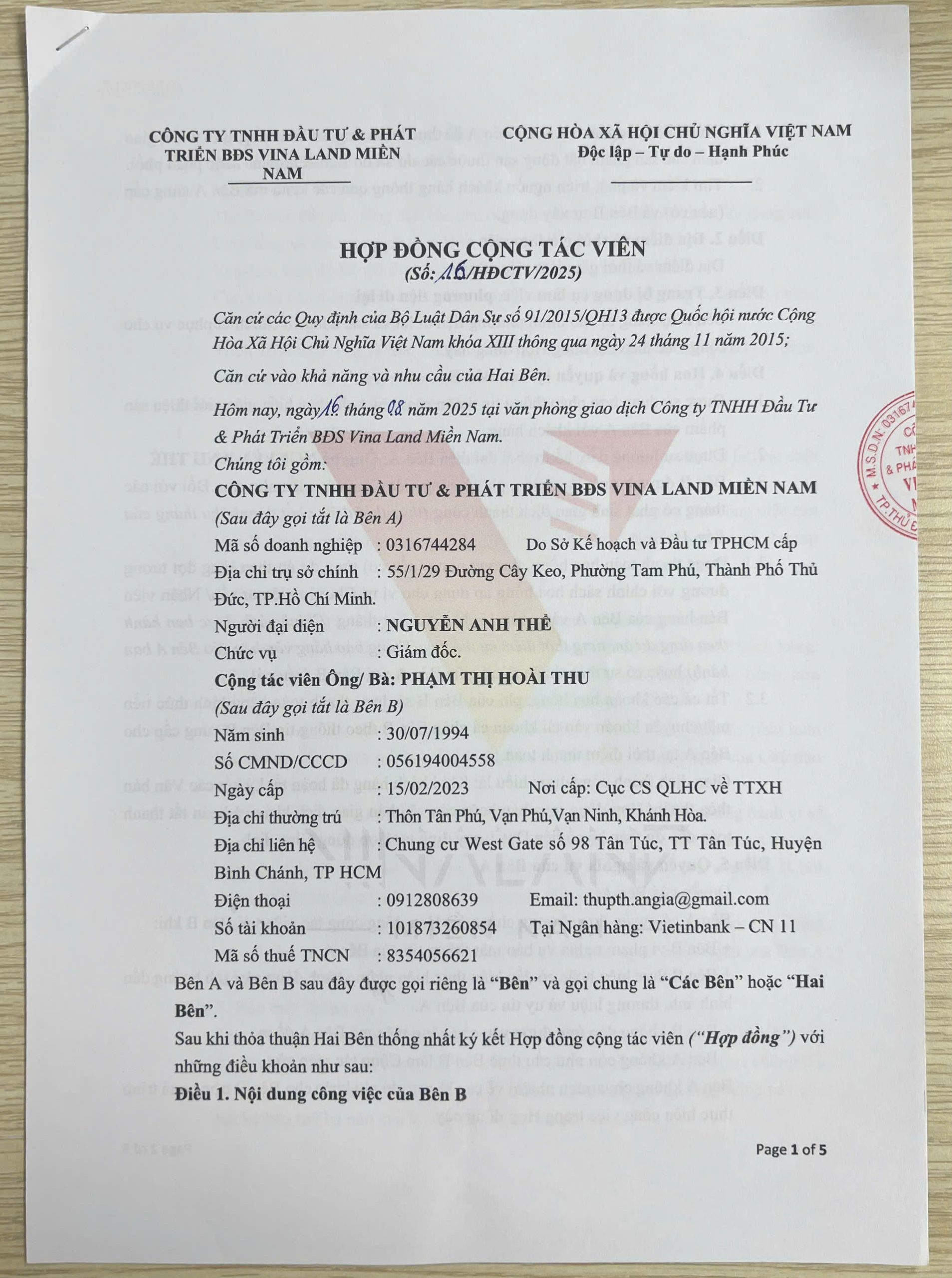 Tôi là Phạm Thị Hoài Thu, một cộng tác viên môi giới bất động sản cá nhân. Tôi hoạt động dưới sự hợp tác và ủy quyền chính thức từ Công ty TNHH Đầu tư & Phát triển BĐS Vinaland Miền Nam. Mối quan hệ hợp tác này được xác lập thông qua Hợp đồng Cộng tác viên số 16/HĐCTV/2025, đảm bảo mọi hoạt động của tôi đều hợp pháp và tuân thủ các quy định của công ty.